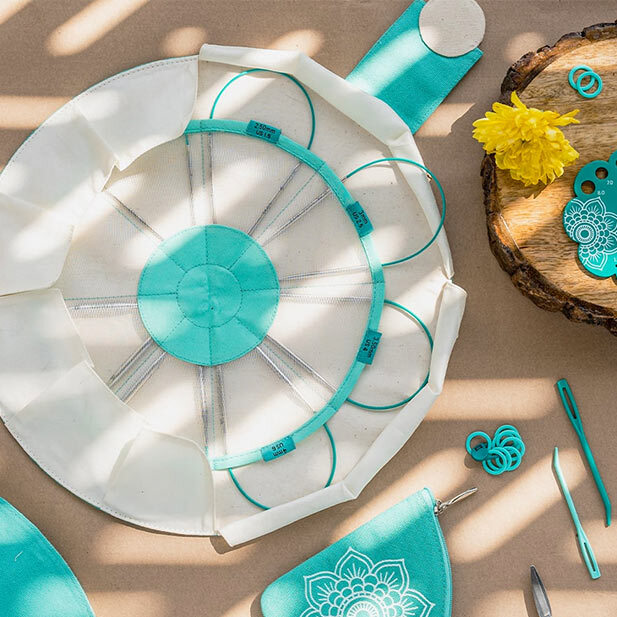 The 25cm fixed circular needles are offered in 8 popular sizes. The set is perfect for knitting socks and other small projects. More fun for knitters who like using fixed circulars, the Explore set is offered in a smart round case that folds to a quarter of the open case size. The artistic case shows off the knitting needles through translucent fabric with the needles appearing like a flower in bloom. The collection of accessories includes useful tools such as a needle gauge, darning needles, 50 stitch markers, and a pair of foldable scissors.